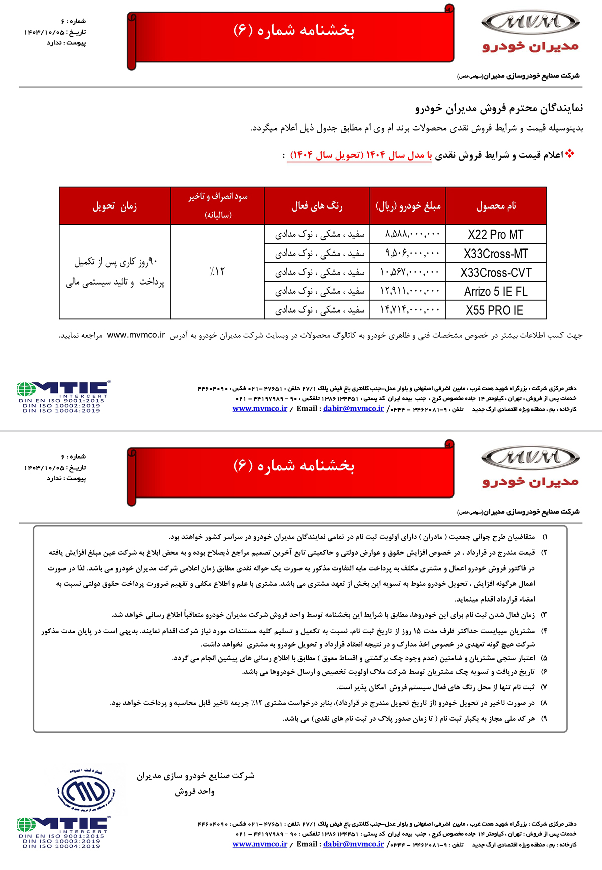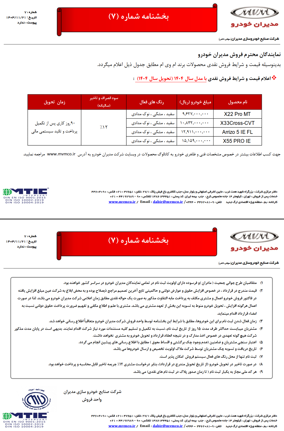 ثبت نام محصولات مدیران خودرو شامل ایکس 55 پرو - ایکس 33 کراس - آریزو 5 FL - ایکس 22 پرو MT در تیر ماه 1404 برای کلیه متقاضیان فعال شد.