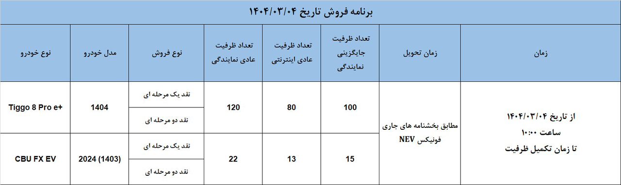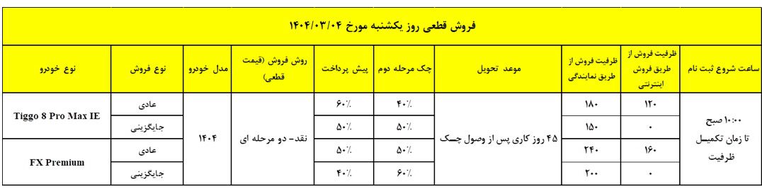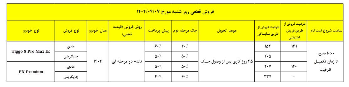 به اطلاع می رساند پیش فروش محصولات فونیکس در روز شنبه مورخ 07/04/1404 انجام می گیرد. فروش بصورت نقد، شرایطی و اقساط می باشد. لیست خودروها و نحوه فروش آنها به شرح زیر می باشد: