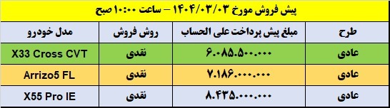 متقاضیان خودروهای ایکس 55 پرو و ایکس 33 کراس اتومات و آریزو 5 می توانند در روز شنبه 25 اسفند 1403 ثبت نام خود را از طریق نمایندگی های مجاز مدیران خودرو انجام دهند.