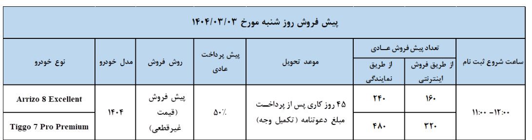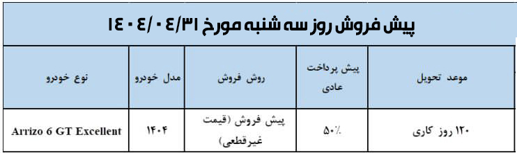 پیش فروش (قیمت غیرقطعی) آریزو 6 جی تی اکسلنت امروز سه شنبه مورخ 31/04/1404 از ساعت 10 تا 11 صبح ادامه دارد. موعد تحویل 120 روزه اعلام شده است.