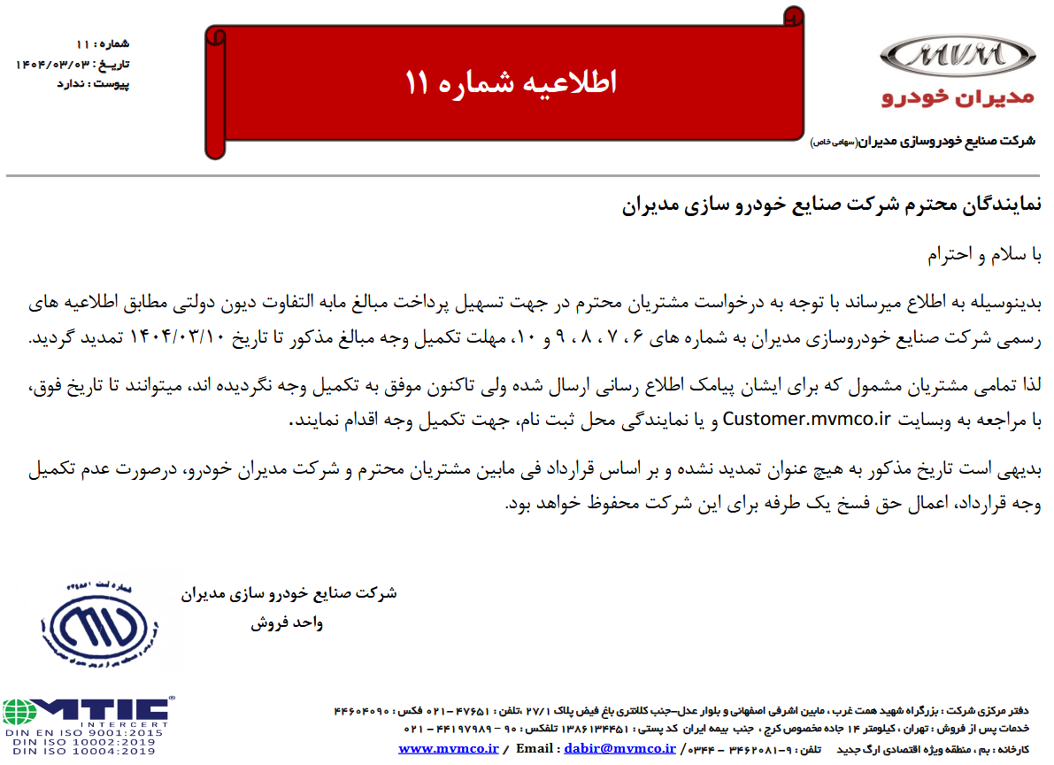 بدینوسیله به اطلاع می‌رساند با توجه به درخواست مشتریان محترم در جهت تسهیل پرداخت مبالغ مابه التفاوت دیون دولتی مطابق اطلاعیه‌های رسمی شرکت صنایع خودروسازی مدیران به شماره‌های 6 ، 7 ، 8 ، 9 ، 10 ، مهلت تکمیل وجه مبالغ مذکور تا تاریخ 10/03/1404 تمدید گردید.