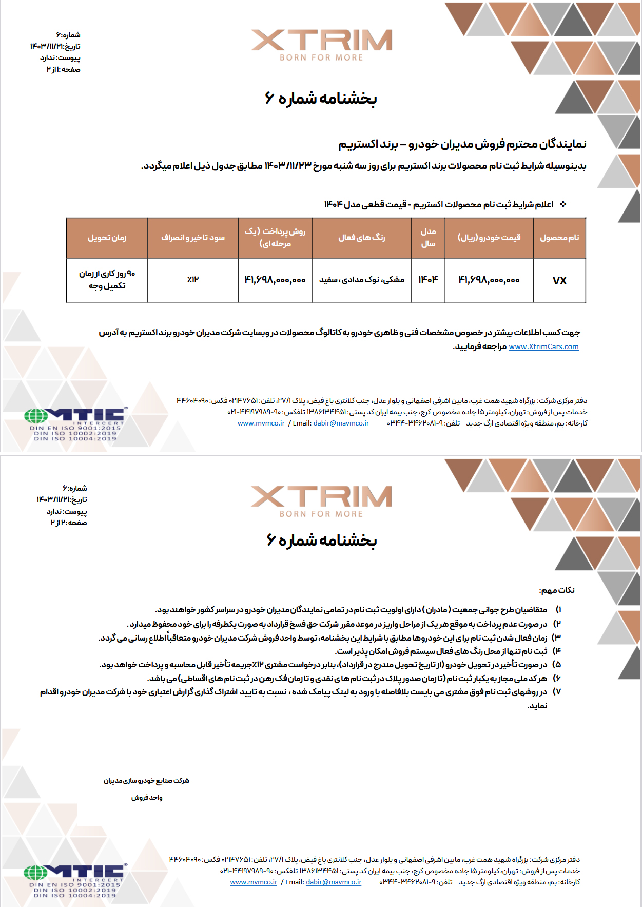 طبق بخشنامه شماره 6 منتشر شده از سوی شرکت مدیران خودرو در تاریخ 21 بهمن 1403 شرایط ثبت نام محصولات برند اکستریم برای سه شنبه مورخ 23/11/1403 مطابق جدول زیر اعلام گردید.